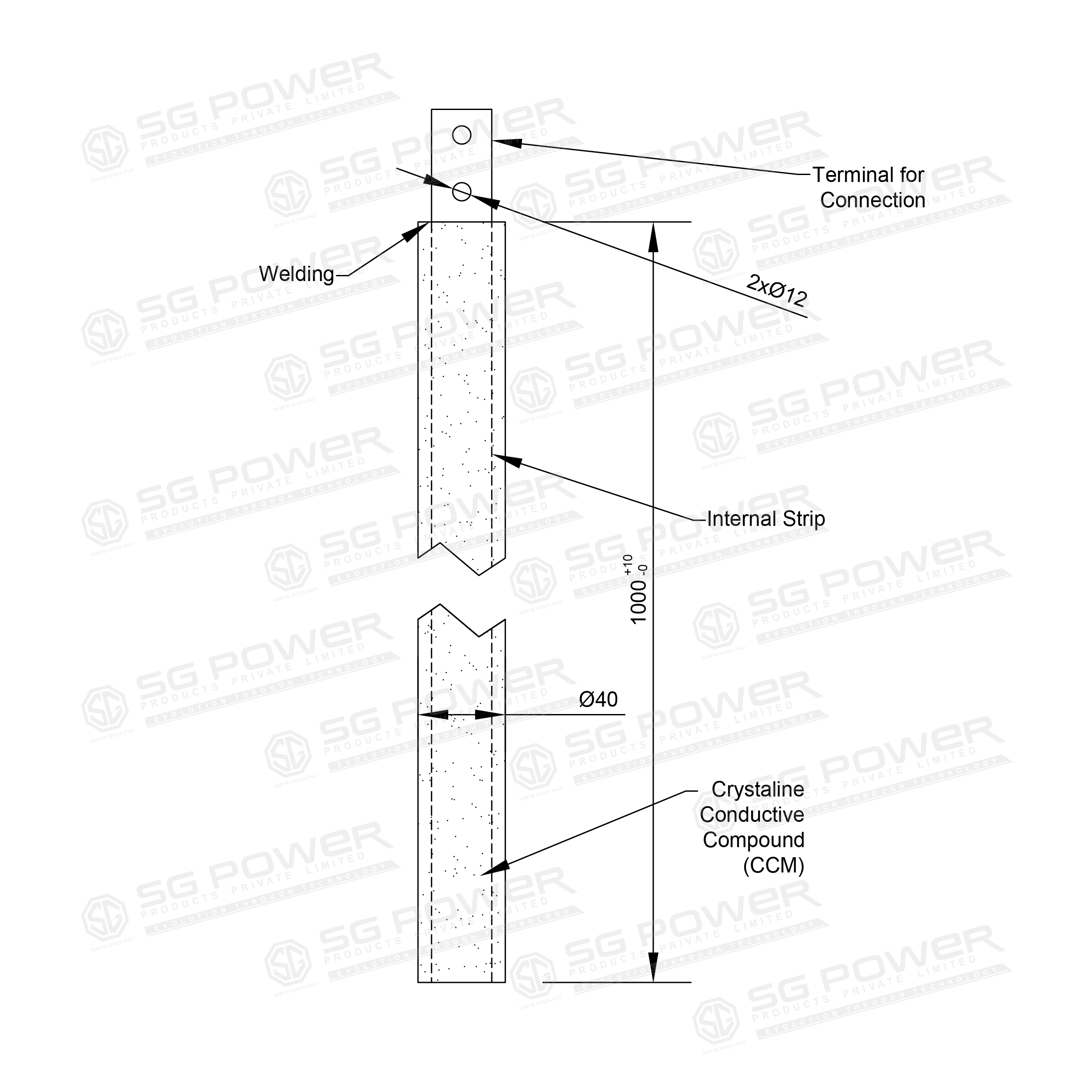 TRUESAFE™ Chemical Earthing manufactured by SG Power Products Pvt. Ltd. is a high-quality Pure Copper Electrode designed for reliable electrical grounding and earthing systems. The electrode features a 40 mm diameter with Class B pipe thickness and a total length of 1 metre. It is supplied with a 25x5x75 mm terminal including 10mm * 2 holes holes for secure cable connection, ensuring effective dissipation of fault current in electrical installations.