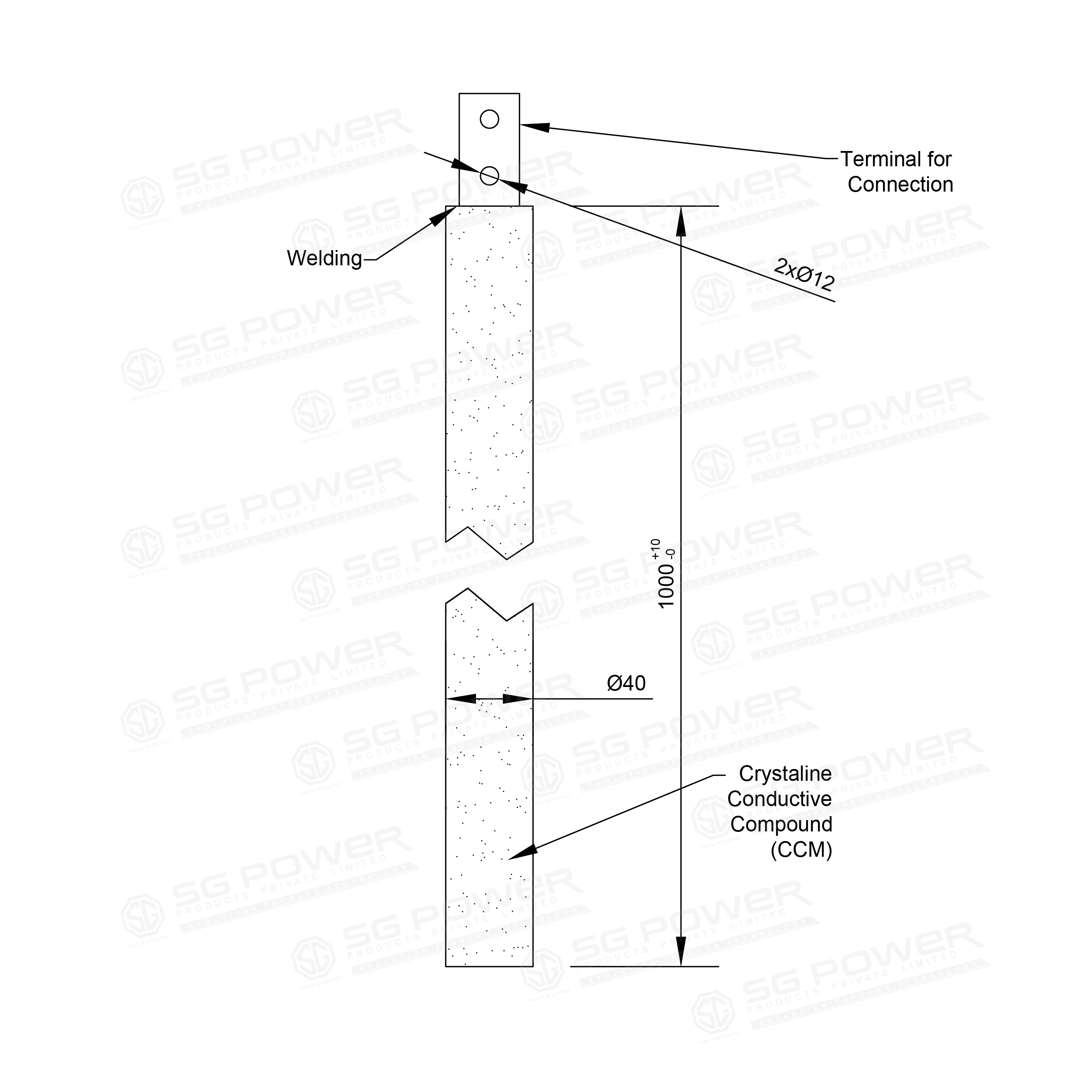 TRUESAFE™ Chemical Earthing manufactured by SG Power Products Pvt. Ltd. is a high-quality Pure Copper Electrode designed for reliable electrical grounding and earthing systems. The electrode features a 40 mm diameter with Class B pipe thickness and a total length of 1 metre. It is supplied with a 25x5x75 mm terminal including 10mm * 2 holes holes for secure cable connection, ensuring effective dissipation of fault current in electrical installations.